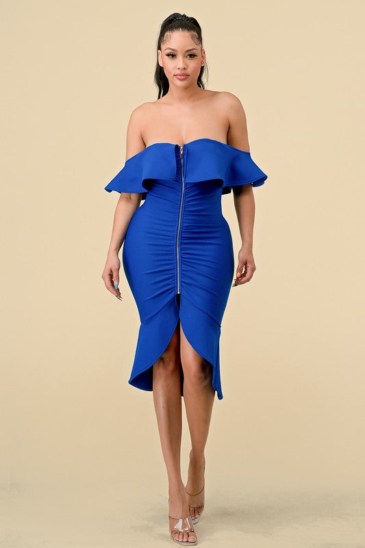 Our Sapphire Dress is a Ruffle Off-Shoulder Zip-Front Bandage Dress. It's Givin'... Night Out, FAB Rooftop Brunch, Wedding Guest and of course Date Night!